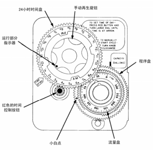 定時器上第二組插銷與第三組插銷之間的孔數是控制注水時間長短的。每一孔相當于 2分鐘,調整時以移動第三組銷子的位置來增減孔數。當外面的一個微開關接觸到第三組的兩根銷子時,再生程序終止。可是定時器會繼續旋轉直至里面的一個微動開關接觸臂轉至定時器的圓形凹口內為止。